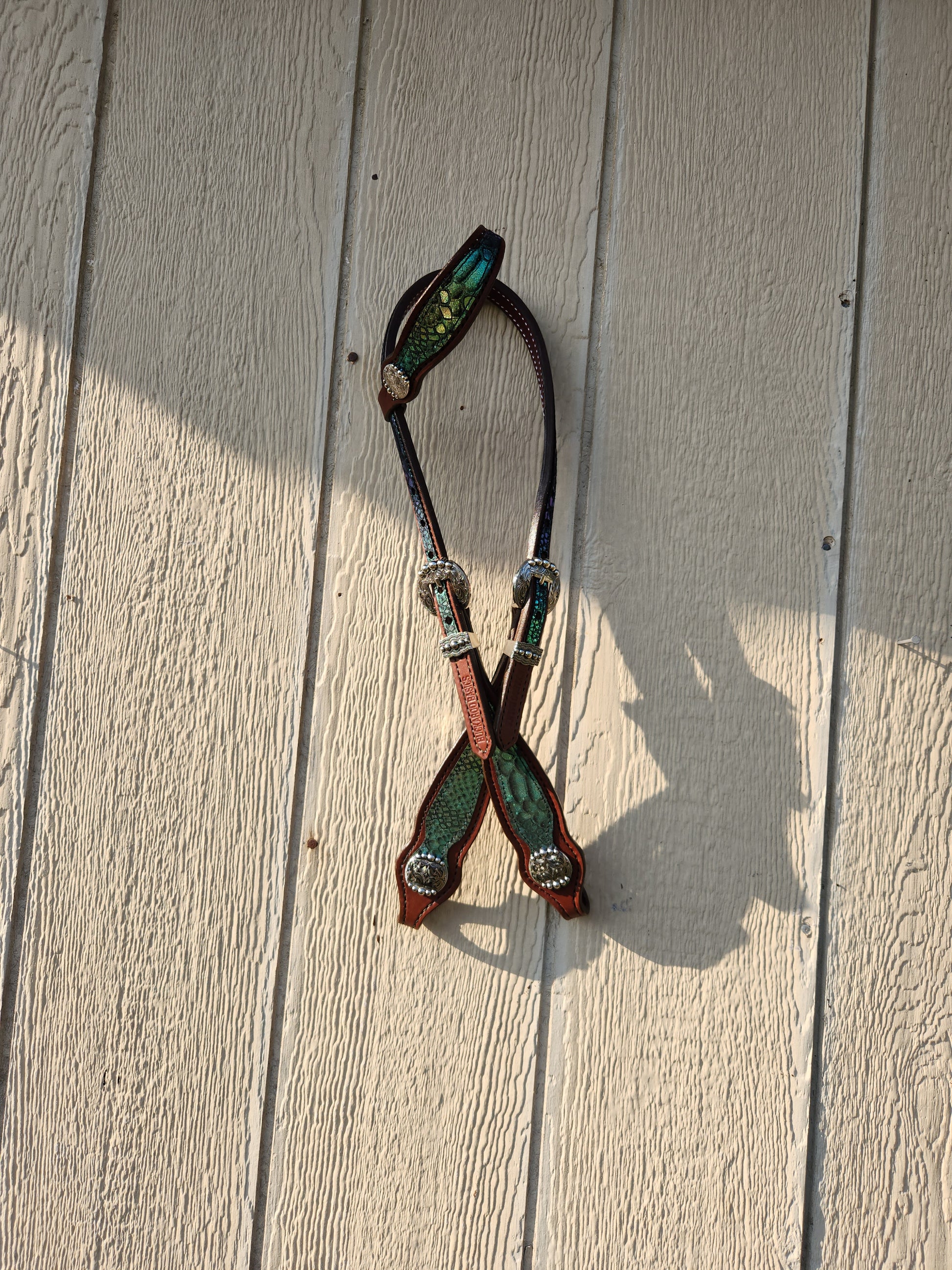 Custom 3 piece tack set consisting of a single ear headstall, breast collar and wither strap. Body of the set is made from Med Brown Wickett and Craig English Bridle leather and lined with premium Solz latigo for durability. The overlay material is machine stitched to the body. The fringe is 8" long and is made from the overlay material and Designer Italian leather. Set comes with matching conchos and buckles from TexHas custom buckles.