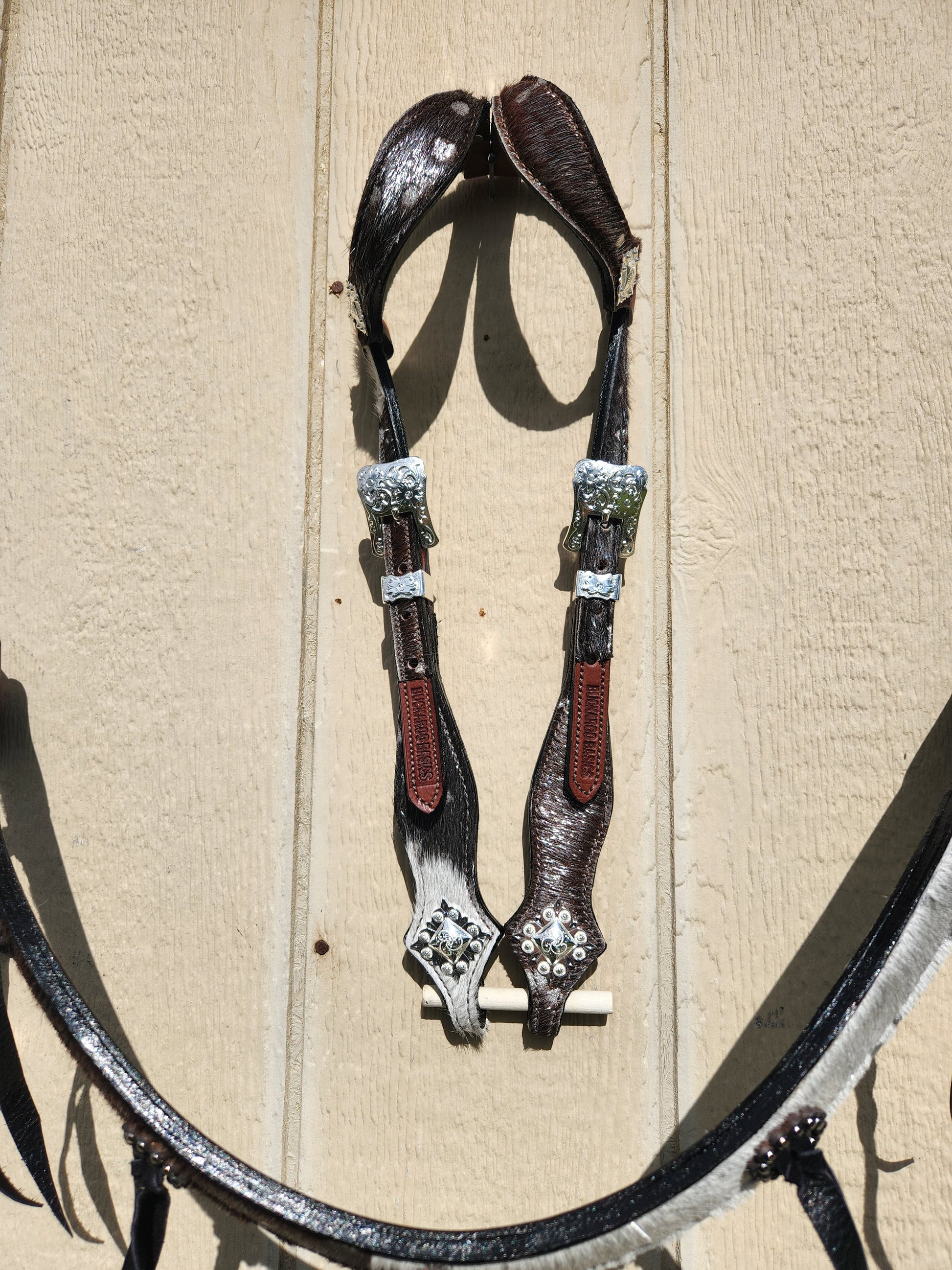 This tack set is made from black Wickett and Craig English Bridle Leather with a metallic black and silver hair on hide overlay. Headstall features a dual single ear set up and is lined with premium Solz Latigo for durability and comfort. The tripping collar style breast collar has matching overlay and tassels for a little flash. Breast collar is also lined with premium Solz Latigo.